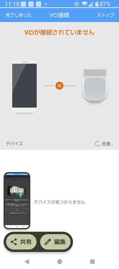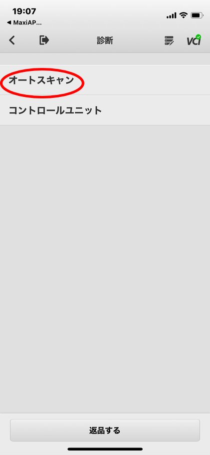 オートスキャンをタップ(舵角センサー類の調整はコントロールユニットから個別の診断を行う必要があります。)