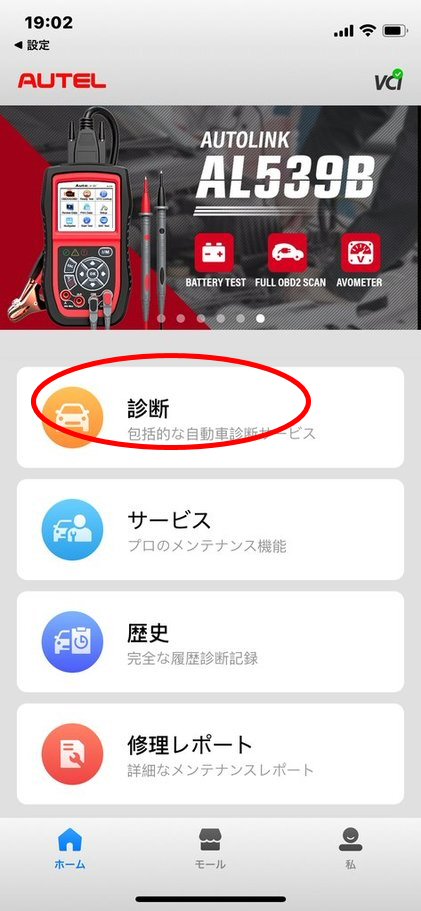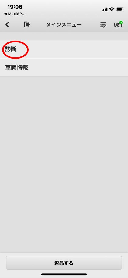 Autel MaxiAP200を起動し右下の「わたし」を開いて「VCI接続」をタップ。