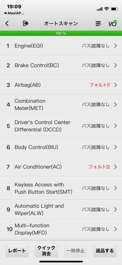 しばらく待っていると診断結果が表示され、問題ある項目は赤文字で「フォルト」と表示されます。