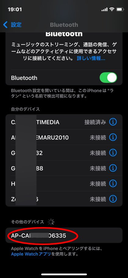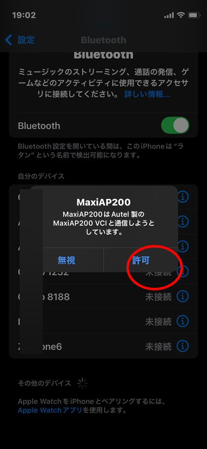 設定からBluetoothメニューを開くと、AP~と記載されたシリアル番号が表示されているのでそれをタップして許可してください。