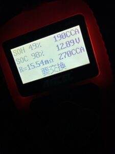SOH(バッテリー健全性45%以上推奨):49%、SOC(充電容量)98%、190CCA(基準値270CCA)。