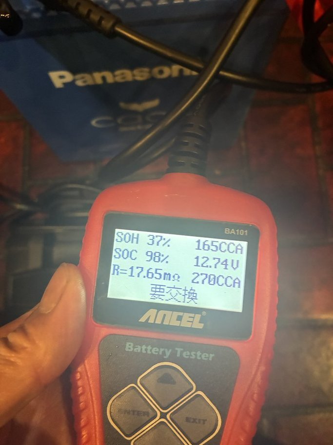 SOH(バッテリー健全性45%以上推奨):37%、SOC(充電容量)98%、165CCA(基準値270CCA)。
