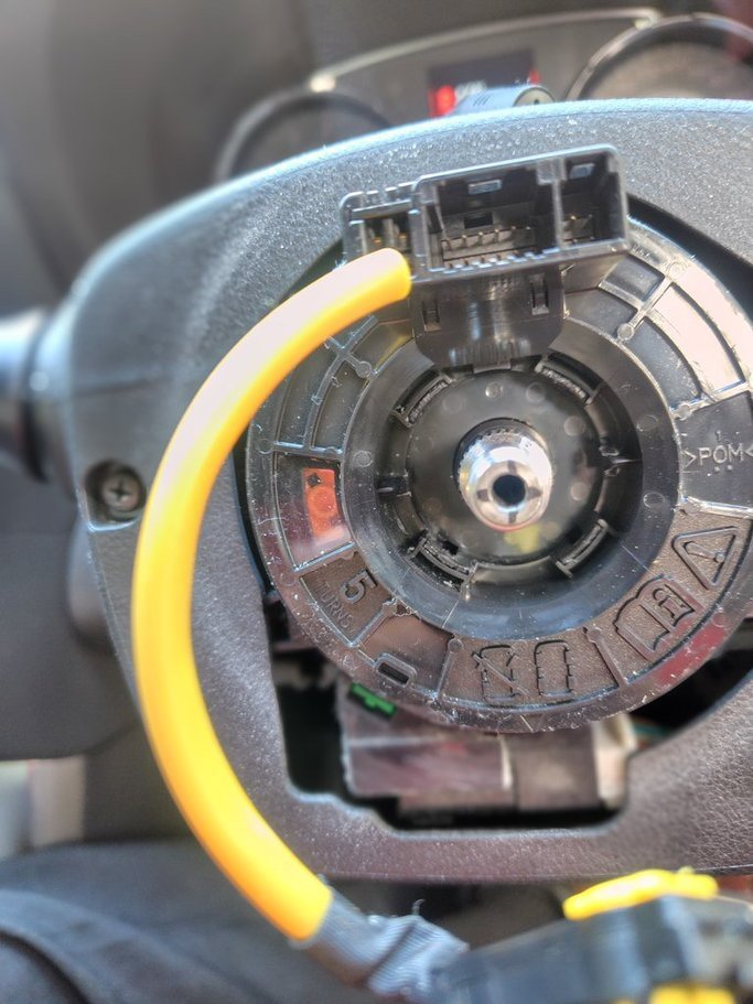 こちらがスパイラルケーブル(舵角センサー)、軽く回す感じで回すとセンターを調整できると思います。力を入れて回すと壊れます。壊してしまうと修理に6万円程度掛かります。